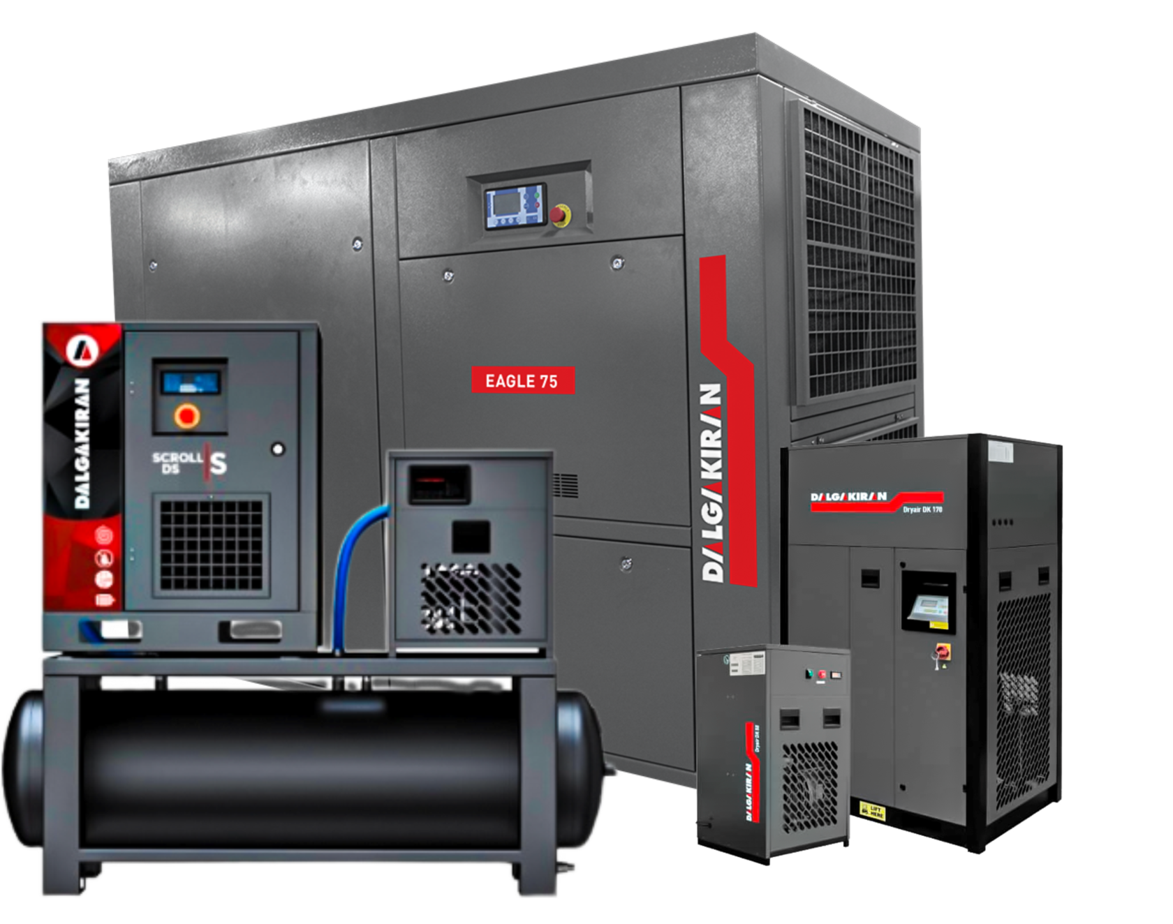 Спиральные компрессоры DALGAKIRAN серии DS обладают безмасляным воздухом класса "0", а спиральная конструкция позволяет вырабатывать высокий КПД.